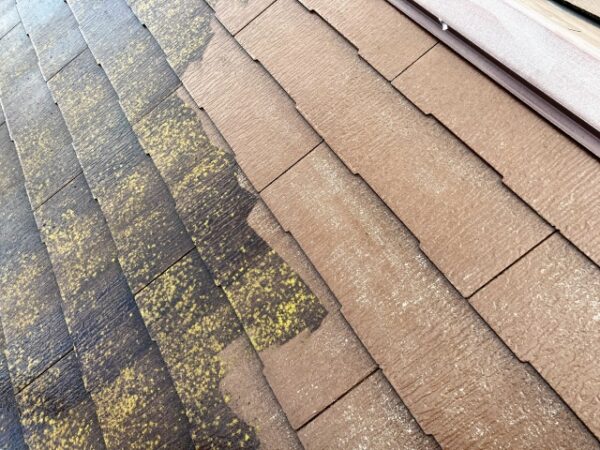 屋根・外壁に長年付着している汚れ、コケ、カビ。汚れが下地に付着すると後々の密着不良を引き起こし下地に付着した汚れとともに塗膜も剥がれてしまします。高圧洗浄はとても重要な塗装前の工程作業なのです。