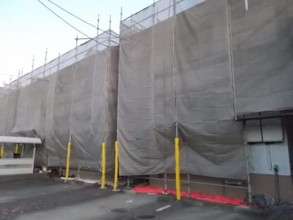 仮設足場に設置する飛散防止ネット、養生で飛散を防ぎます。車等への塗料飛散が予測される場合は、車用の飛散防止カバーをかけてガードします。