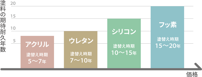 耐久性の高いものから順にフッ素・シリコン・ウレタン・アクリルです。