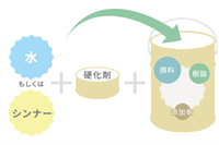 水もしくはシンナーと硬化剤を混ぜて使用するタイプの塗料硬化剤の化学反応により強固な塗膜が作られ、耐久性・密着力に優れている。しかし、使うたびに硬化剤の計量・攪拌をキチンとしないと品質にばらつきが出てしまう。